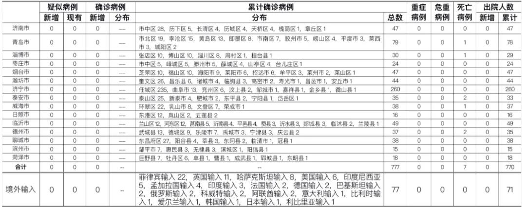 山东无新增本地疑似病例、确诊病例。累计报告确诊病例777例,死亡7例,治愈出院770例。