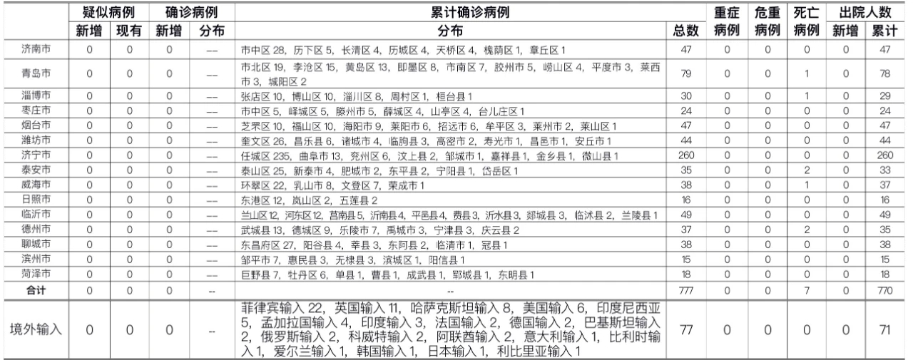 12月1日0时至24时,山东无新增本地疑似病例、确诊病例。累计报告确诊病例777例,死亡7例,治愈出院770例。