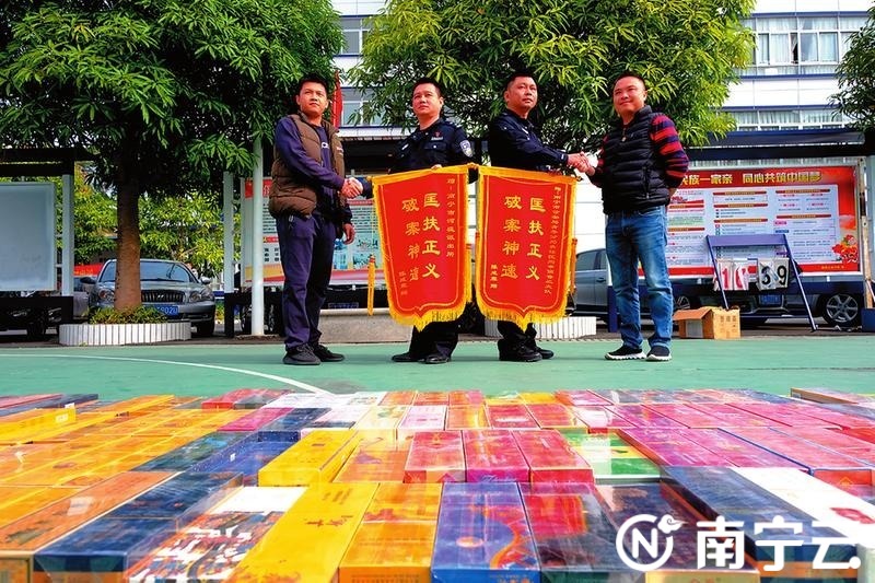 南宁云—南宁晚报讯(记者宋延康 通讯员黄玉兰)昨日上午,南宁市公安局青秀分局河堤派出所举行返还赃物仪式,将近期破获的系列盗窃商铺案被追回的名贵香烟等财物悉数返还。多名受害人领回失物,并送来锦旗表示感谢。当天,派出所民警针对沿街商铺开展防范宣传,上门指导人防、技防措施,提升安全防范水平,着力提高群众安全感和满意度。