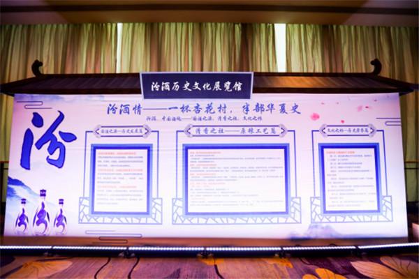 在会场走廊展示了汾酒的发展历程文化墙 ,以及酒款陈列,六千年酿造史,凝聚如今汾酒魂。