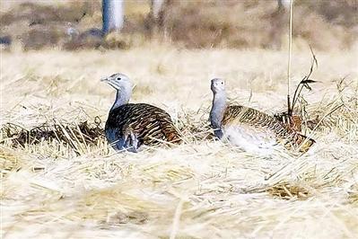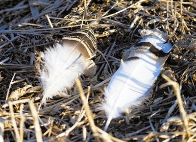 在大鸨觅食的稻田里发现两片大鸨羽毛。