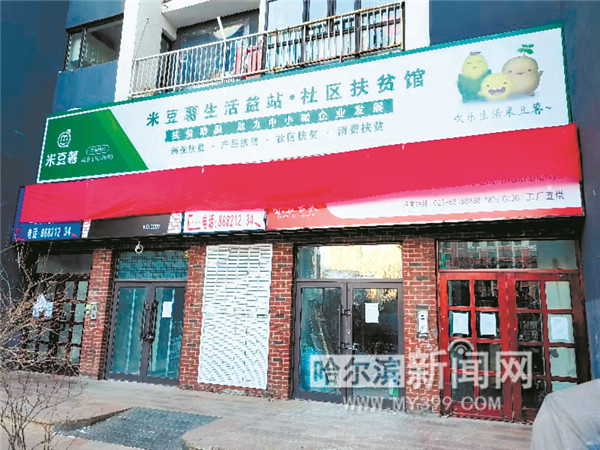 12月1日10时,记者来到该小区看到,10号楼位于小区内且正对小区先锋路大门,该楼一楼的公共服务用房玻璃门紧锁,一侧店面悬挂有“米豆薯生活益站·社区扶贫馆”字样牌匾,另一侧店面悬挂着“餐饮超市”字样的牌匾。透过玻璃门看到室内地面已铺设地板,且放置有货柜。