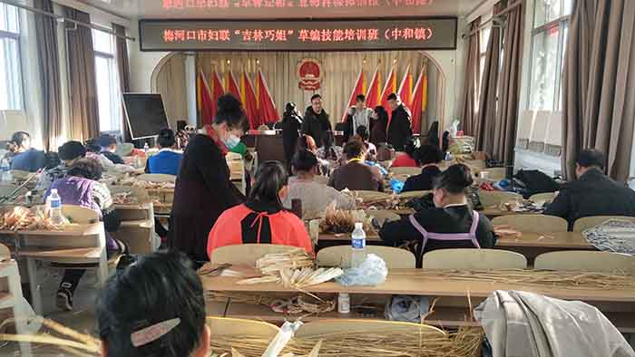 室外冰天雪地,室内温暖如春。11月底,梅河口市中和镇政府大会议室内十分热闹。为帮助全镇广大妇女掌握实用技术,增强致富本领,拓宽致富渠道,市妇联与中和镇政府共同举办了草编工艺品技能培训班,全镇11个村草编爱好者35人参加培训。