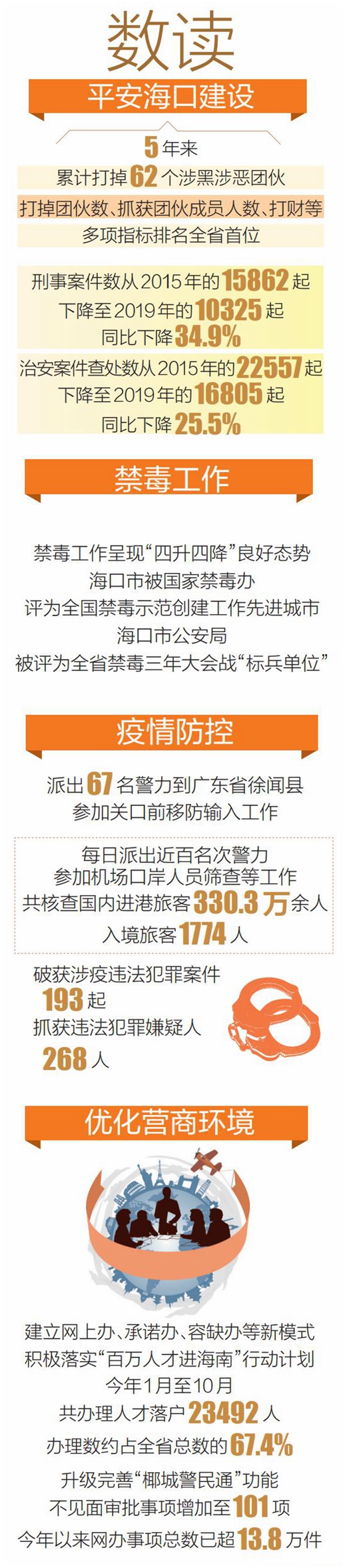 五年来,海口全市公安机关深入推进扫黑除恶专项斗争,累计打掉62个涉黑涉恶团伙,打掉的团伙数、抓获团伙成员人数、打财等多项指标排名全省首位,其中打掉11个涉黑组织。开展禁毒三年大会战,禁毒工作呈现“四升四降”的良好态势,海口市被国家禁毒办评为全国禁毒示范创建工作先进城市,海口市公安局被评为全省禁毒三年大会战“标兵单位”。始终保持对黄赌、入室盗窃、“两抢”、电信网络诈骗等违法犯罪行为的严打高压态势,刑事案件数从2015年的15862起下降至2019年的10325起,同比下降34.9%,治安案件查处数从2015年的22557起下降至2019年的16805起,同比下降25.5%;其中八类严重暴力案件、盗窃、“两抢”等案件同比均明显下降,社会治安状况处于近年来最好水平。