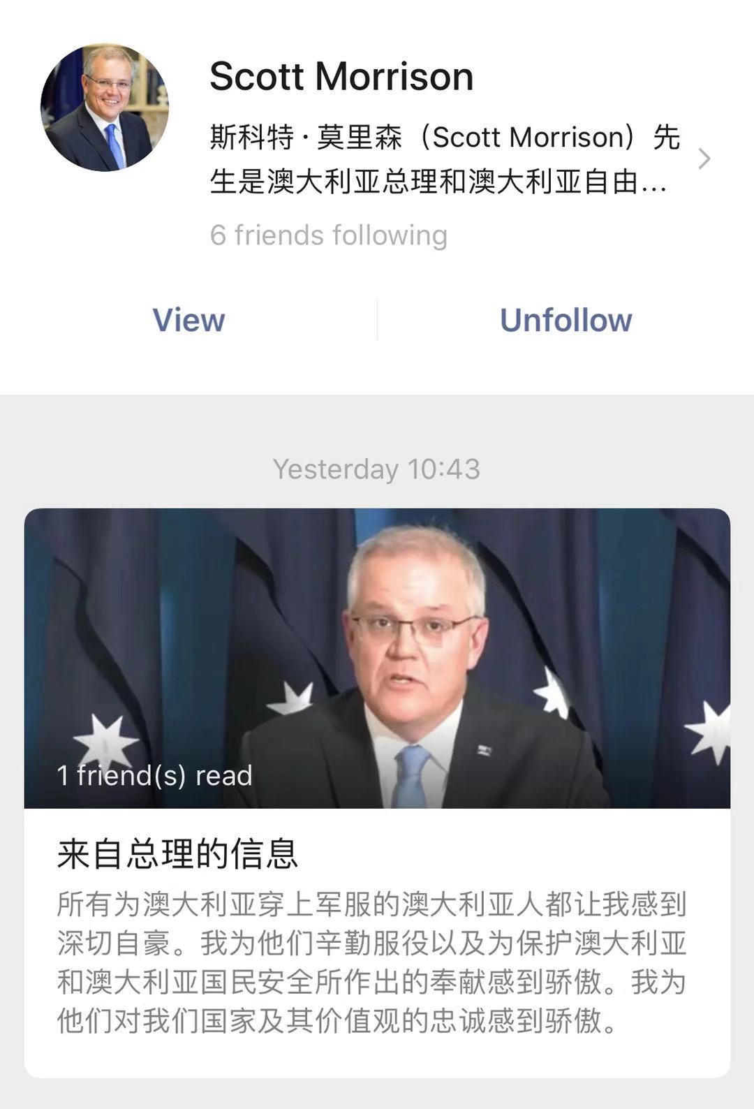 澳大利亚总理莫里森1日晚在微信公众账号上发布《来自总理的信息》一文。