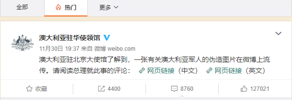 11月30日晚些时候,澳驻华使领馆官方微博公然发布莫里森指摘中国的中、英文版链接,并附说明称“澳大利亚驻北京大使馆了解到,一张有关澳大利亚军人的伪造图片在微博上流传。请阅读总理就此事的评论”,双标昭然,气焰嚣张。此条微博当即引爆中国舆论场,引发中国网民声讨。