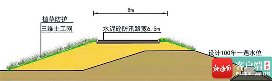 海口江东新区地处南渡江尾闾,地势平坦。南渡江右岸堤防承担着江东新区的防洪安全保护任务,但现状堤防防洪标准为30年一遇,已不能满足如今的现实需求。按照100年一遇防洪标准,绕城高速以下段现状堤防超高不足,尤其是海瑞大桥以下至麻余村段右堤超高不足问题尤为突出。“南渡江右岸堤防等级为3级,堤顶高于100年一遇洪水位0.7米至1.2米,不满足堤顶超高1.55米的要求,堤顶宽度为6米,由于右岸江东新区的规划建设,防洪标准提升到100年一遇,相应堤防工程等级应提高到1级。”海口市堤防工程建设管理中心项目技术负责人王绵珊说:“现在我们在抓紧建设南渡江右岸堤防改造工程这个项目,保障江东新区的防洪安全,预计年底之前完工。同时,在施工过程中考虑南渡江沿线绿色生态景观空间的建设要求,为后续建设景观工程打好基础。”