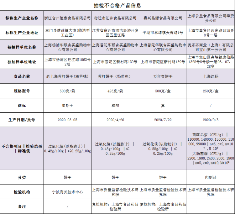 今天,本市市场监督管理局公布了本市最新食品安全抽检结果,在935批次抽检样品中,有4批次不合格,涉及老上海苏打饼干(海苔味)、苏打饼干(奶盐味)、万年青饼干,不合格项目为过氧化值;上海红肠的不合格项目为菌落总数、大肠菌群。