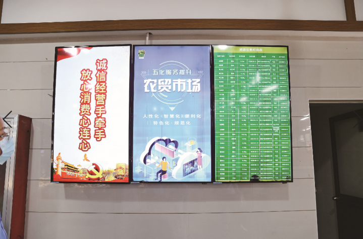 如今,无论是走进骆家庄农贸市场,还是新时代家居生活广场,都能看见一块数字大屏幕。“今日经营总额多少”“菜价多少”“实时销量最高摊主是谁”等信息,都可以在大屏幕上找到答案。