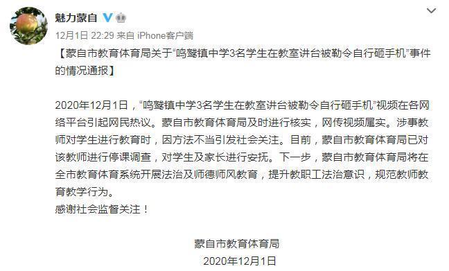 据云南省蒙自市委外宣办官方微博消息,针对网上流传的"鸣鹫镇中学 3 名学生在教室讲台被勒令自行砸手机"视频一事,蒙自市教育体育局 1 日发布情况通报称,已对此事及时进行核实,网传视频属实。