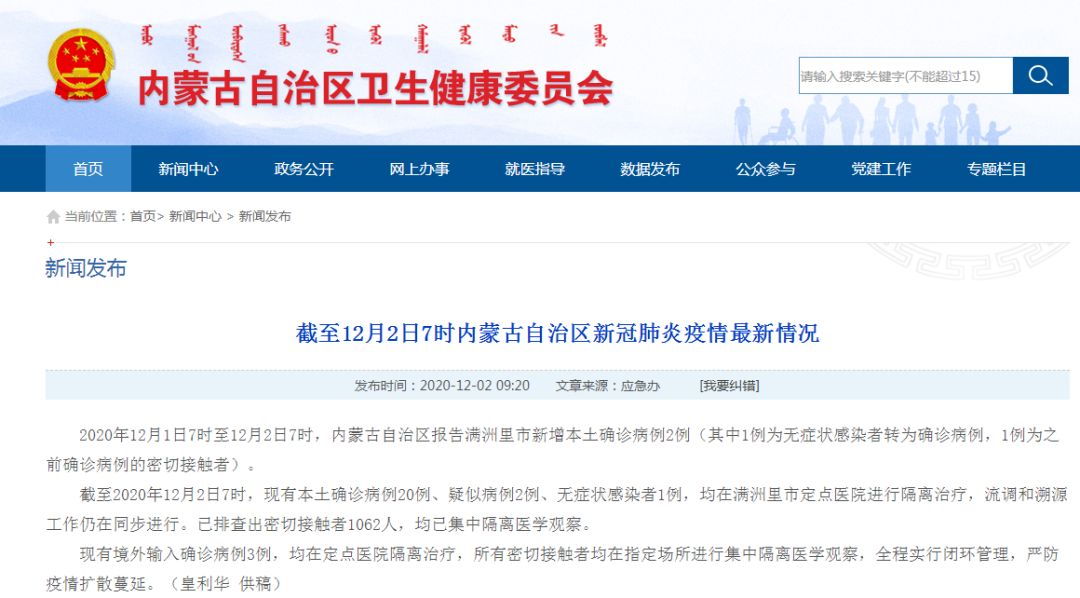 2020年12月1日7时至12月2日7时,内蒙古自治区报告满洲里市新增本土确诊病例2例(其中1例为无症状感染者转为确诊病例,1例为之前确诊病例的密切接触者)。
