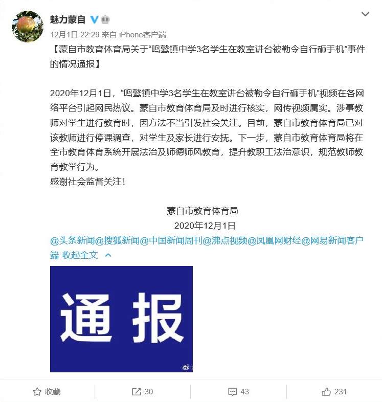12月1日,云南省红河州蒙自市“鸣鹫镇中学3名学生在教室讲台被勒令自行砸手机”的视频引起网民热议。当晚,蒙自市教育体育局发布通报,称网传视频属实,并已对该教师进行停课调查,对学生及家长进行安抚。