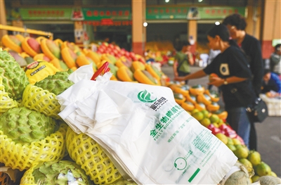 12月1日,在三亚市吉阳区鸿港农贸市场,商家使用全生物降解塑料袋销售水果。武威 摄