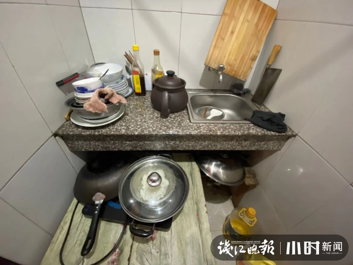 套房里有卫生间和烧电磁炉的小厨房,空调、热水器、家具齐全。