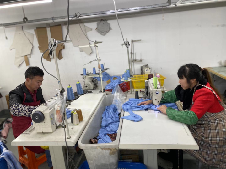张金财和赵志兰文化程度都不高,他们是整件车工。两人的缝纫机面对面摆着,夫妻档技术过硬,是做了30年的熟练工。