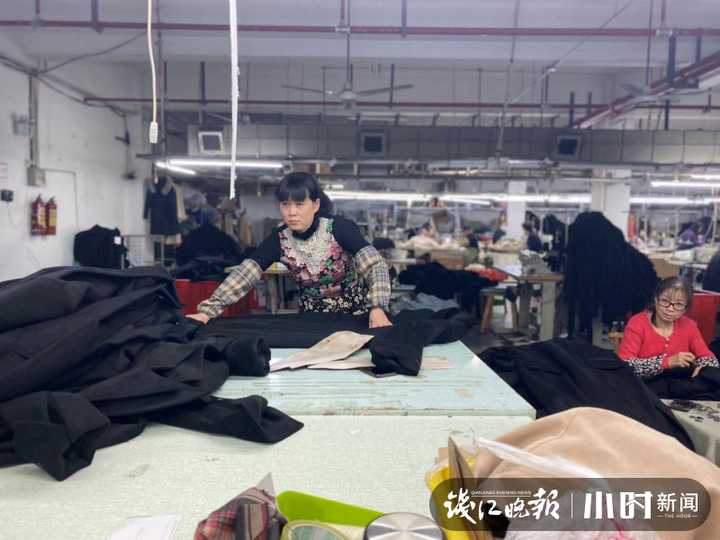 车间里摆放着几十台缝纫机,有一半区域是流水作业,工人们你做领子,我做袖子,最后拼成一件衣服。