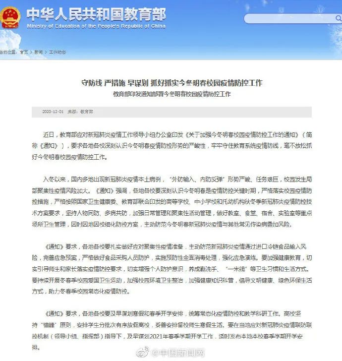 近日,教育部发文部署今冬明春校园疫情防控工作。其中,高校坚持“错峰”原则,安排学生分批次有序放假离校,妥善安排留校师生寒假生活;及早谋划2021年春季学期开学工作,适时发布本地本校春季学期开学安排。