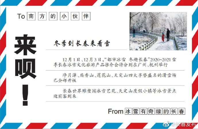 为把长春的冰雪资源带出省,让冰雪旅游走进南方城市,吸引更多的南方朋友来长春赏冰玩雪,12月1日、12月3日,“都市冰雪 冬趣长春”2020—2021雪季长春冰雪文化旅游产品推介会将分别在广州、杭州举行。将向广州、杭州的市民呈现直观立体的冰雪长春,向南方的朋友们发出诚挚邀请,来长春体会一次梦中的“冰雪奇缘”。
