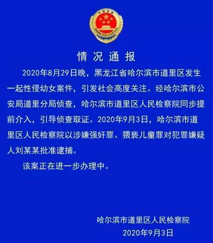 12月2日,据黑龙江省哈尔滨市中级人民法院官微消息,哈尔滨市中级人民法院依法不公开审理并当庭宣判刘某国奸淫幼女案,被告人被依法判处死刑。