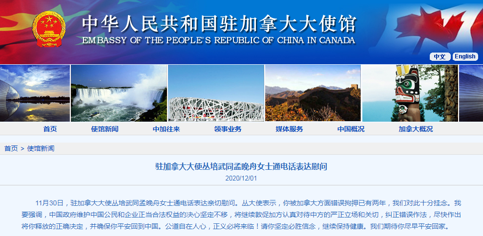 11月30日,驻加拿大大使丛培武同孟晚舟女士通电话表达亲切慰问。丛大使表示,你被加拿大方面错误拘押已有两年,我们对此十分挂念。我要强调,中国政府维护中国公民和企业正当合法权益的决心坚定不移,将继续敦促加方认真对待中方的严正立场和关切,纠正错误作法,尽快作出将你释放的正确决定,并确保你平安回到中国。公道自在人心,正义必将来临!请你坚定必胜信念,继续保持健康。我们期待你尽早平安回家。