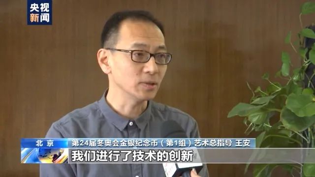 第24届冬季奥林匹克运动会金银纪念币(第1组)艺术总指导 王安:为了更好地诠释冰雪运动的文化内涵,我们进行了技术的创新,首次采用了光变鳞彩的新工艺技术,通过光束实现了金银纪念币表面在不同的光影下呈现出色彩斑斓的艺术效果,这种金银纪念币的新技术使得更好地衬托了主体形象。