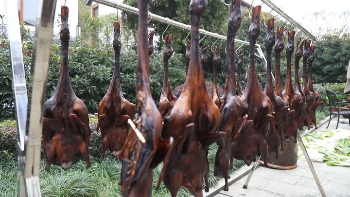 做着“扩胸运动”的鸭子一字排开,像是置身于健身房,颇为壮观。经过半天的沥干后,鸭子就可以进入下一个步骤——酱制。