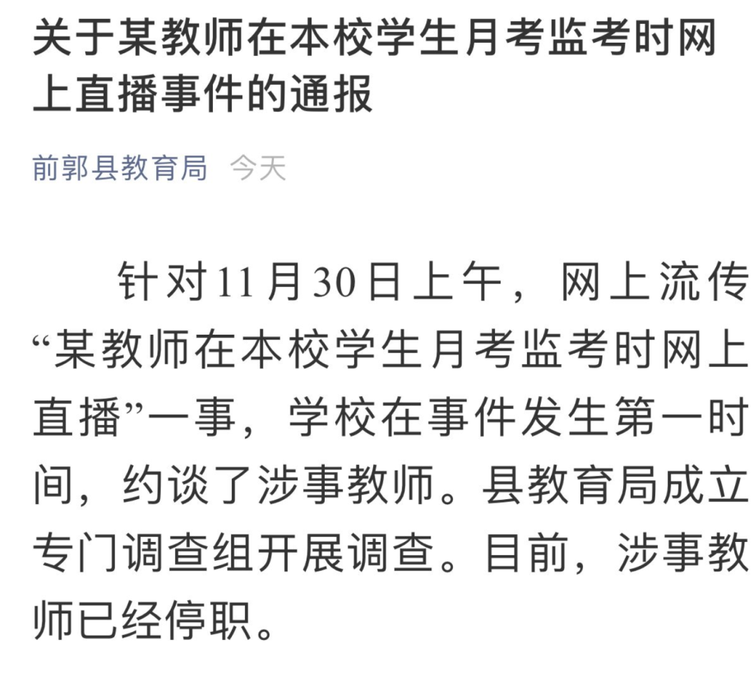 据前郭县教育局微信公众号30日发布的消息,针对11月30日上午,网上流传“某教师在本校学生月考监考时网上直播”一事,学校在事件发生第一时间,约谈了涉事教师。县教育局成立专门调查组开展调查。目前,涉事教师已经停职。