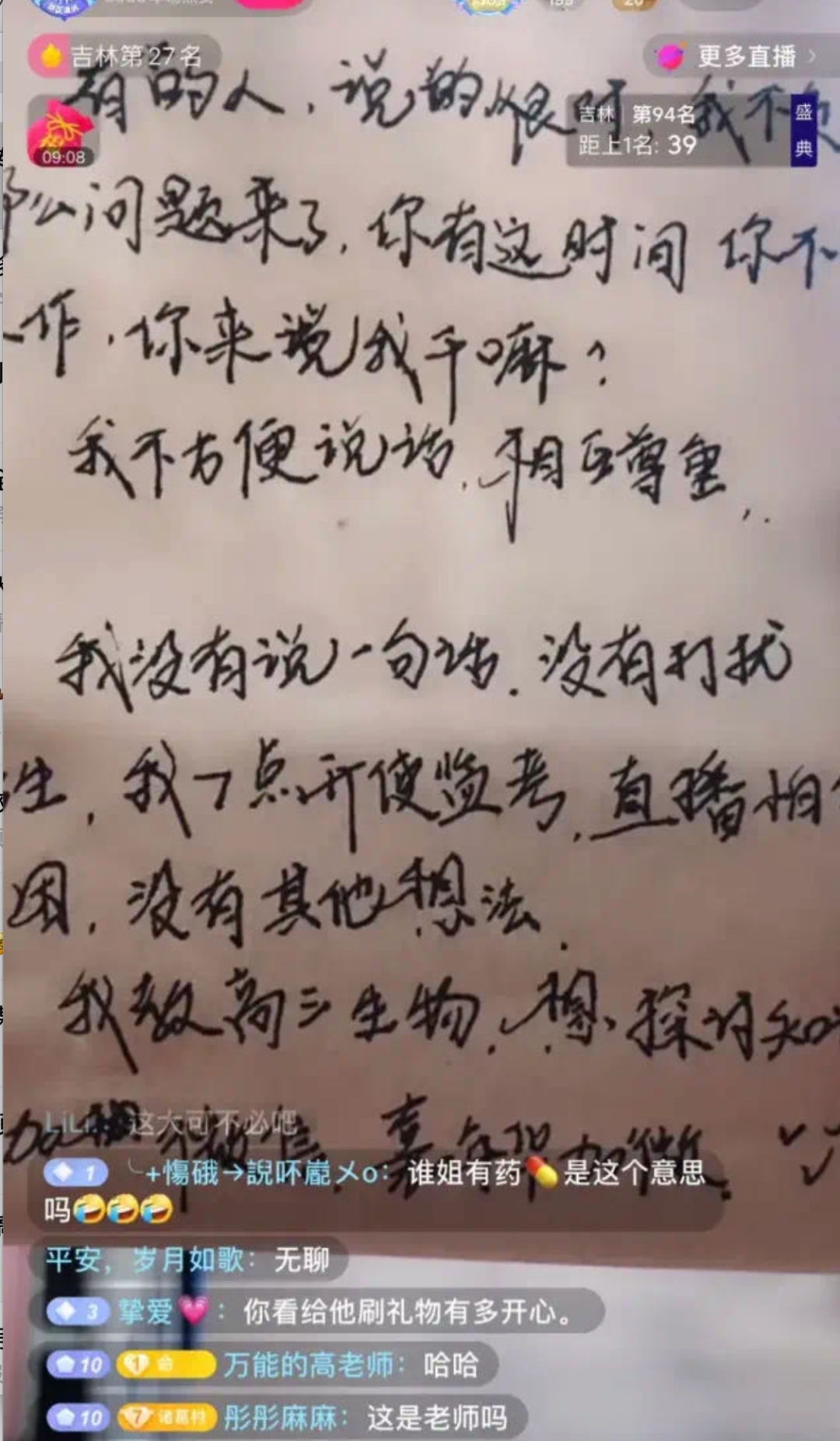 随后,该名老师在直播时称“怕打扰学生”用写字回应,文字中他自称没有打扰学生,“开直播是怕困,没有其他想法。”