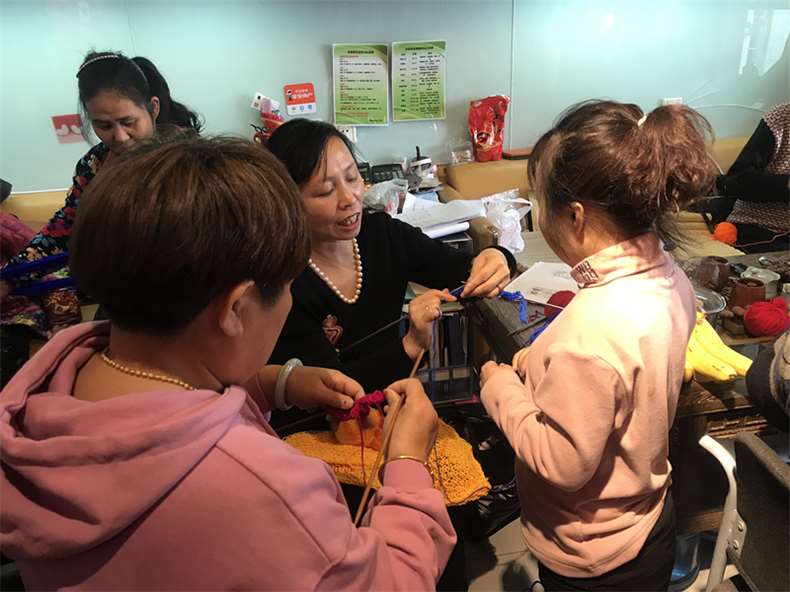 来到活动室,张哥就跟连姐一起先盘线,整理完后,连姐织,张哥就在一旁理线,不让妻子在织的过程中受到任何影响。连姐心灵手巧,编织十分利落。