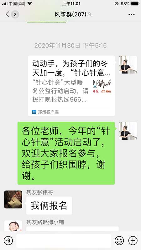 郑州晚报联合阿里巴巴天天正能量及全国20家媒体发起的2020“针心针意”大型暖冬公益行动12月1日正式启动。