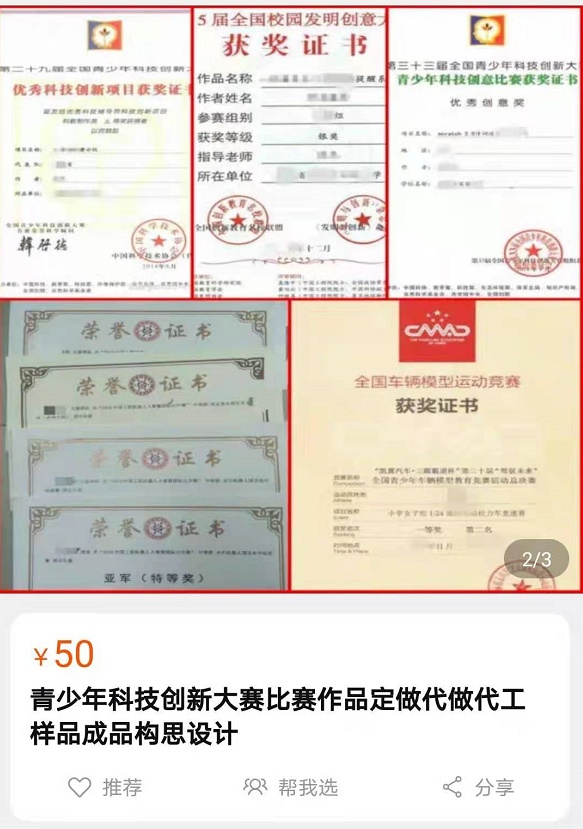 记者调查发现,参赛热也催生了一门“生意”。有专门从事“代画”业务的商家宣称,只需百元就能根据家长要求定制参赛画作,已经帮不少孩子获得了国家级、省市级奖项。甚至还有商家瞄准了各级青少年科技大赛,声称只要提供一个想法,他们就能帮孩子完成从技术方案构思到研究报告撰写再到作品实物制作的所有步骤,如果家长愿意加钱,他们还能“包得奖”。
