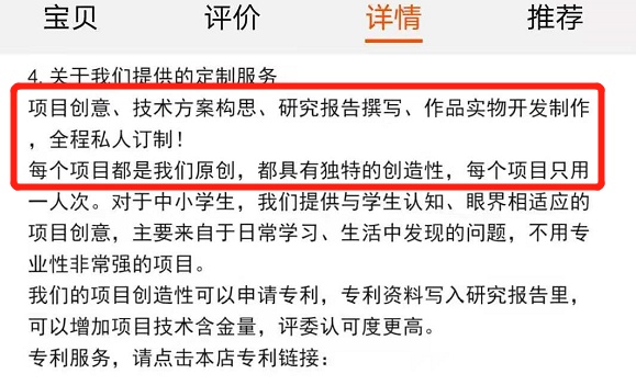 客服人员:每一个项目都是重新核定报价,不是给一个别人用过的作品,这没意思。因为前段时间的科创比赛领域已经被曝光过一次。爸爸的研究论文给自己的孩子结果得了奖,整体的负能量还蛮大的。