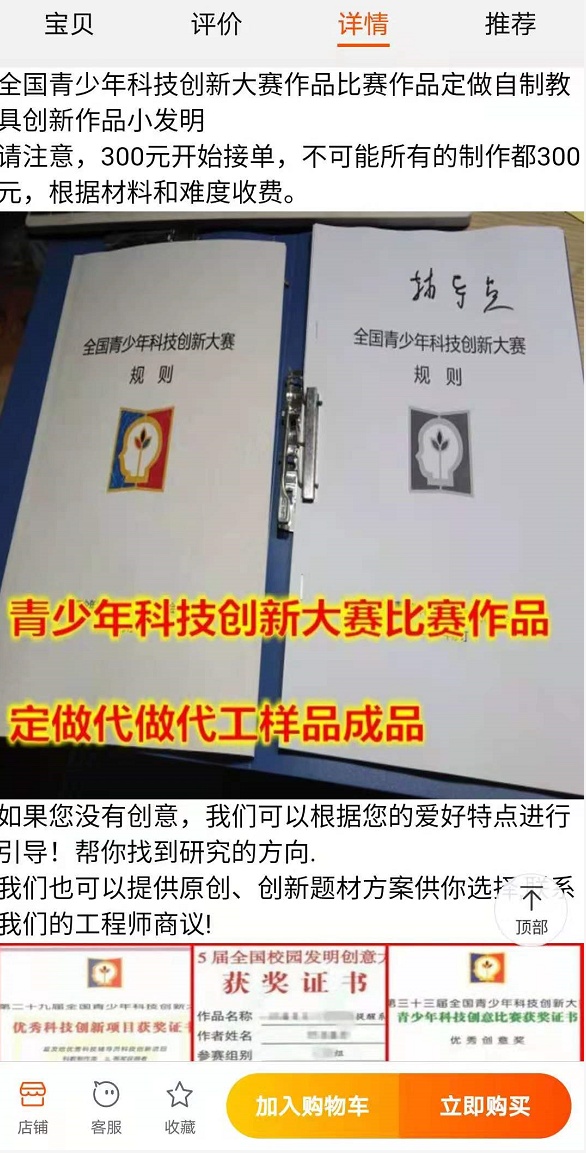 除了绘画比赛,还有商家瞄上了各级青少年科技大赛。记者以“青少年科技创新大赛定做”为关键词进行检索,在淘宝、咸鱼等平台也能找到大量相关信息。在淘宝平台,有商家称,他们提供全国青少年科技创新大赛等比赛的作品“定制”服务,并且展示了代工样品,还晒出了各类科创比赛的获奖证书。记者咨询了一家商铺,客服人员告诉记者,只要提供一个想法,他们就能帮孩子完成从技术方案构思,到研究报告撰写,再到作品实物制作的所有步骤。
