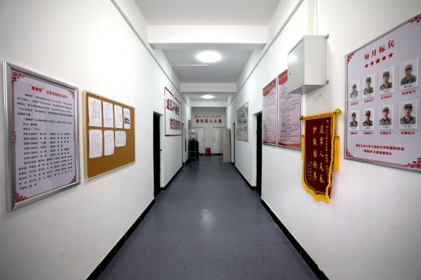 这所大学生示范公寓名为“退伍军人之家”,门口的公示栏上贴着各类通知和内务检查表,走廊两旁分布着7间宿舍,宿舍尽头的架子上还摆放着头盔、军大衣、对讲机等物品,干净整洁的环境令人耳目一新。整洁程度可媲美部队的宿舍,吸引了该校许多学生来此参观学习。