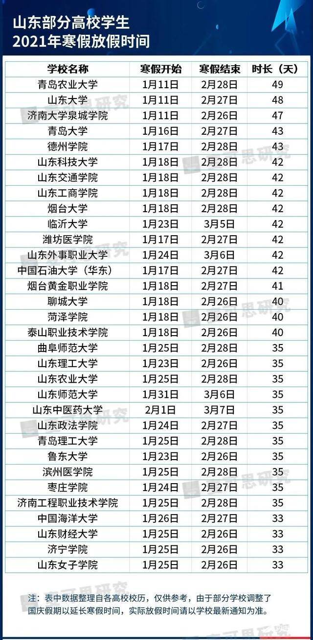 目前,省内数十家高校也已明确了假期时间,其中最长的青岛工学院,54天;最短的滨州医学院,28天!寒假超40天、不足50天的高校有31所,像青岛农业大学、青岛农业大学海都学院、威海职业学院、山东农业工程学院四所高校寒假时间为49天;而山东第一医科大学、济南大学泉城学院放假47天;中国石油大学(华东)、山东科技大学、青岛科技大学、山东理工大学、临沂大学、青岛大学、烟台大学、潍坊医学院、潍坊学院、滨州学院、山东交通学院、山东工商学院、烟台大学文经学院、中国石油大学胜利学院、烟台南山学院、青岛黄海学院等16所高校为42天。