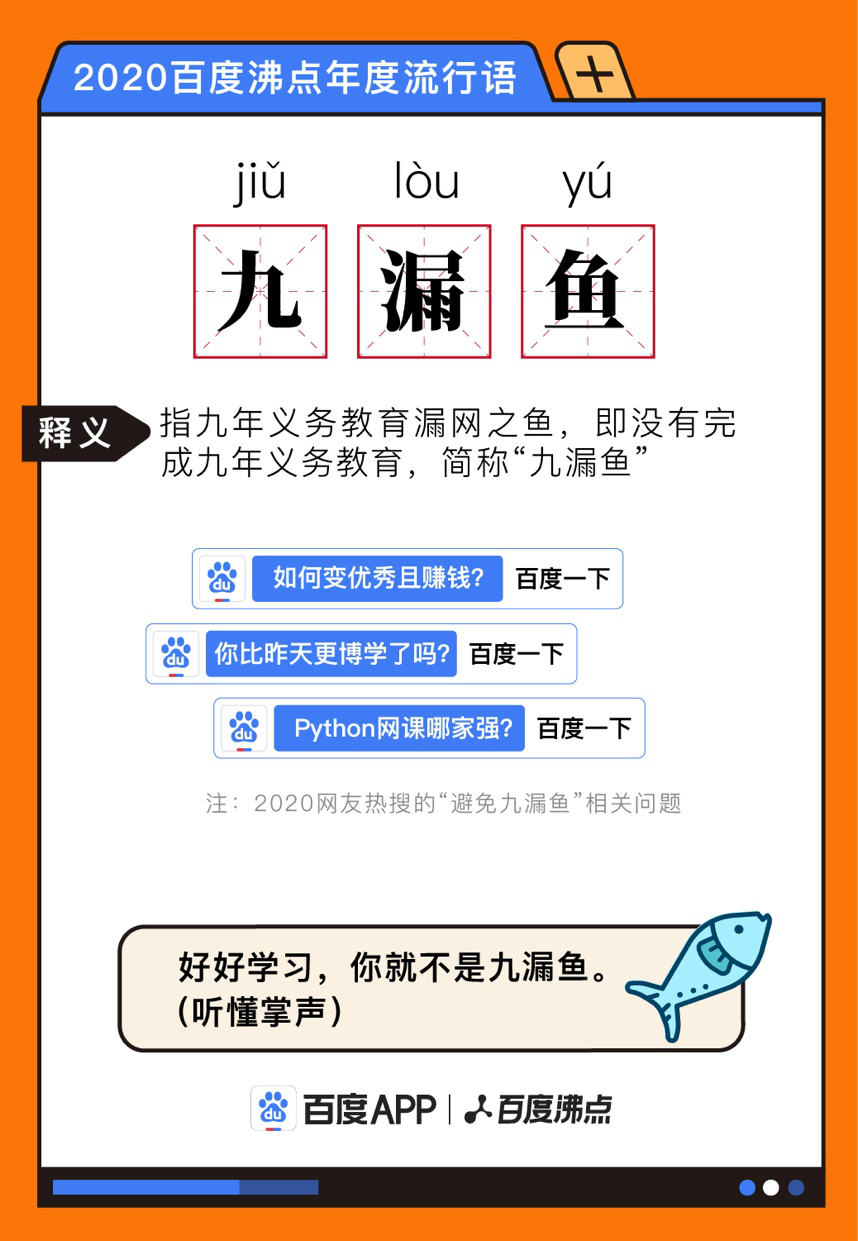 “九漏鱼”是“九年义务教育的漏网之鱼”的缩写,多用来比喻文化程度较低的艺人;“爷青回”指看到了以前熟悉的事物,尤其是90后看到儿时的经典影视节目,不禁感叹“我的青春回来了”。