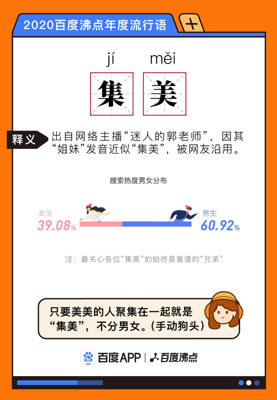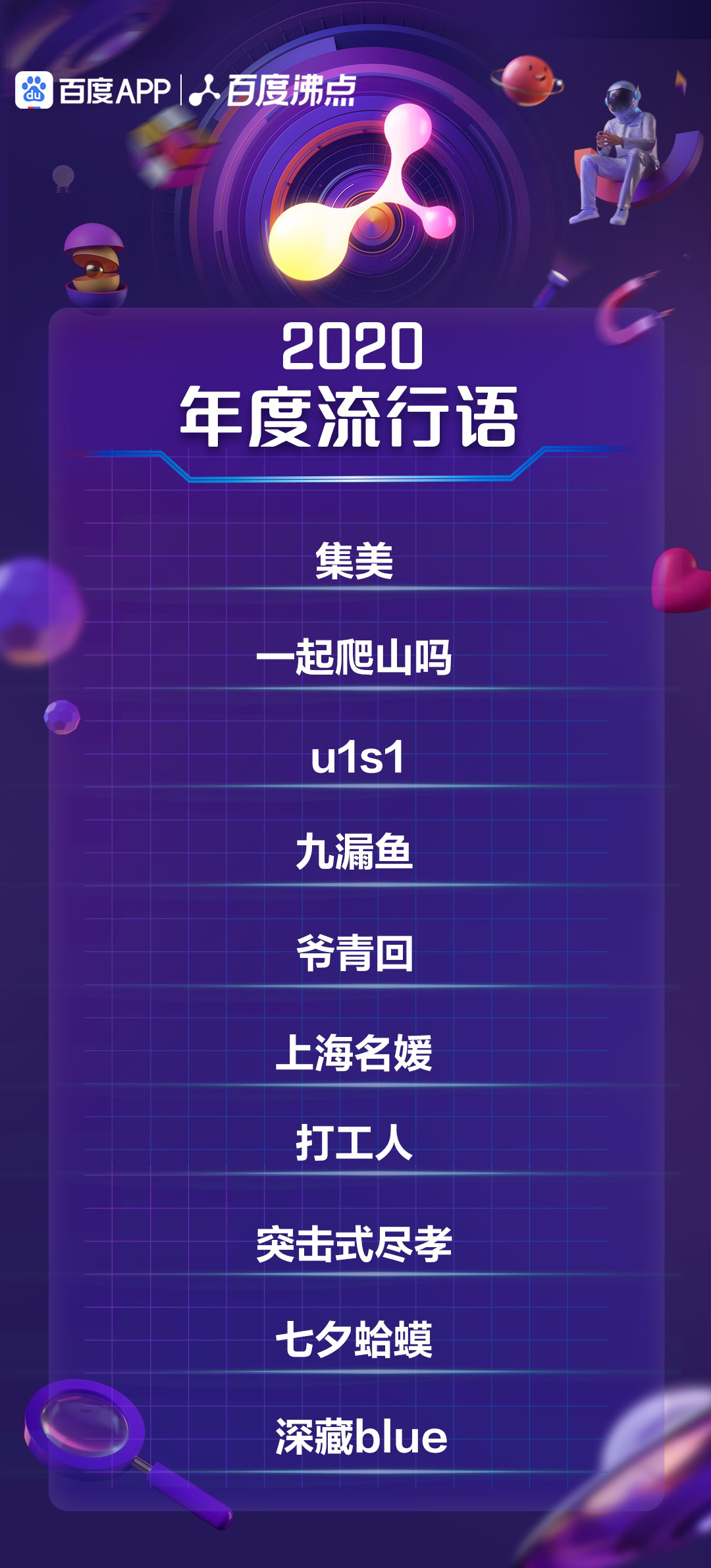2020百度沸点年度流行语榜单正式出炉:集美、一起爬山吗、u1s1、九漏鱼、爷青回、上海名媛、打工人、突击式尽孝、七夕蛤蟆、深藏blue成为今年网民搜索热度最高的十大流行语。2020百度沸点完整榜单也将于近期发布。