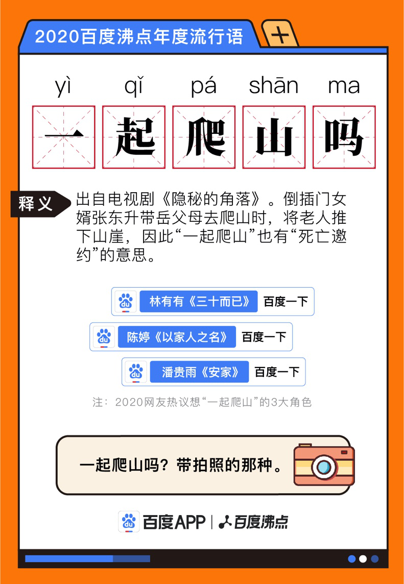 “一起爬山吗”出自热播剧《隐秘的角落》。剧中,倒插门女婿张东升带岳父岳母爬山时,因平日积怨将两位推下了山。“一起爬山吗”也就成为了网友们平时聊天过程中玩笑式的“死亡邀约”。