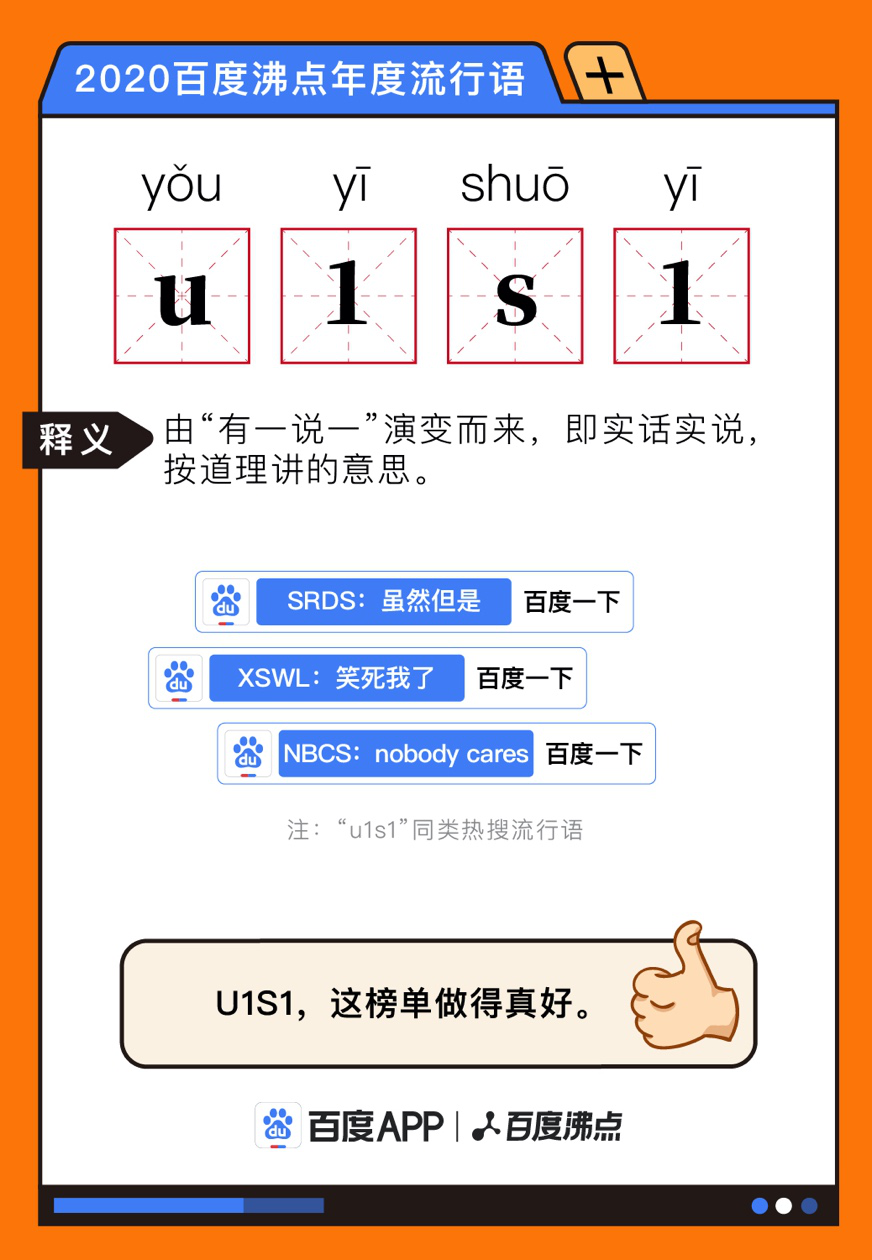 “u1s1”则是“有一说一”的简写,最初来自百度贴吧。在大家一起讨论的时候,先来一句“u1s1”,然后开始讲自己的观点,这样说话不仅能促进交流,还能让观点更加鲜明。甭管有没有依据,敢于“有一说一”的态度,这届网友就值得一个赞。