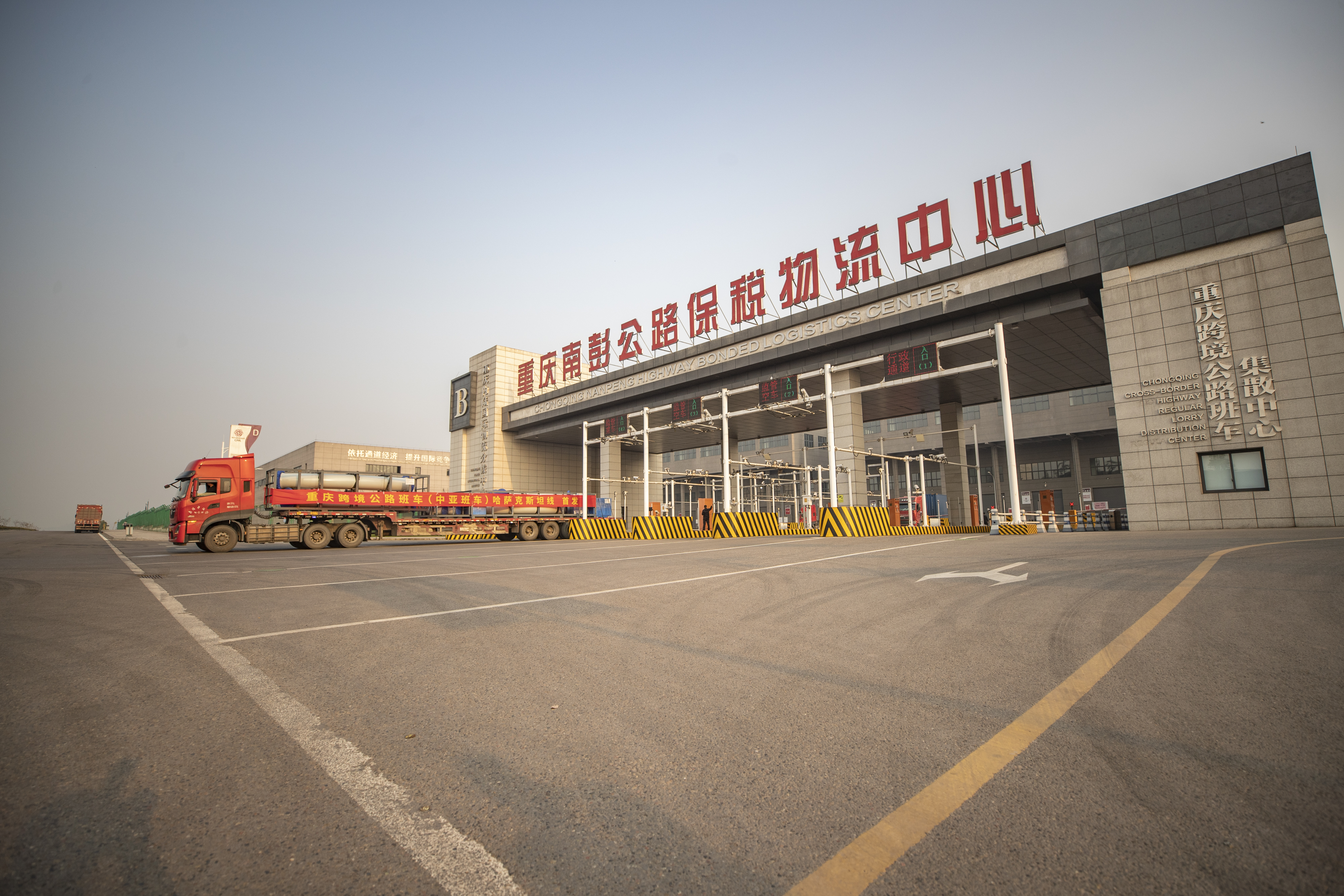重庆跨境公路班车从重庆南彭公路保税物流中心驶出开往哈萨克斯坦。新华社记者 黄伟 摄