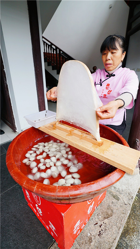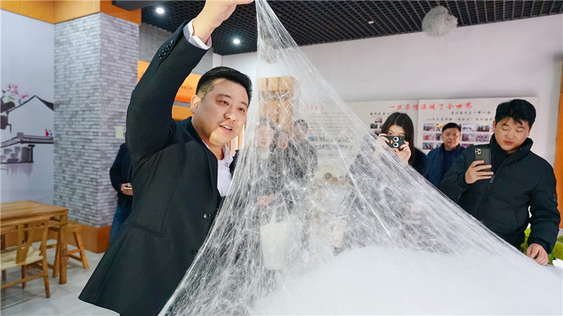 在采访现场,潘晓丰向采访团展示了传统的缫丝工艺以及蚕丝被的制作过程。在娴熟的制作手艺下,小小的蚕茧就这样在工人们的手中变成绸缎和蚕丝被销往世界各地。