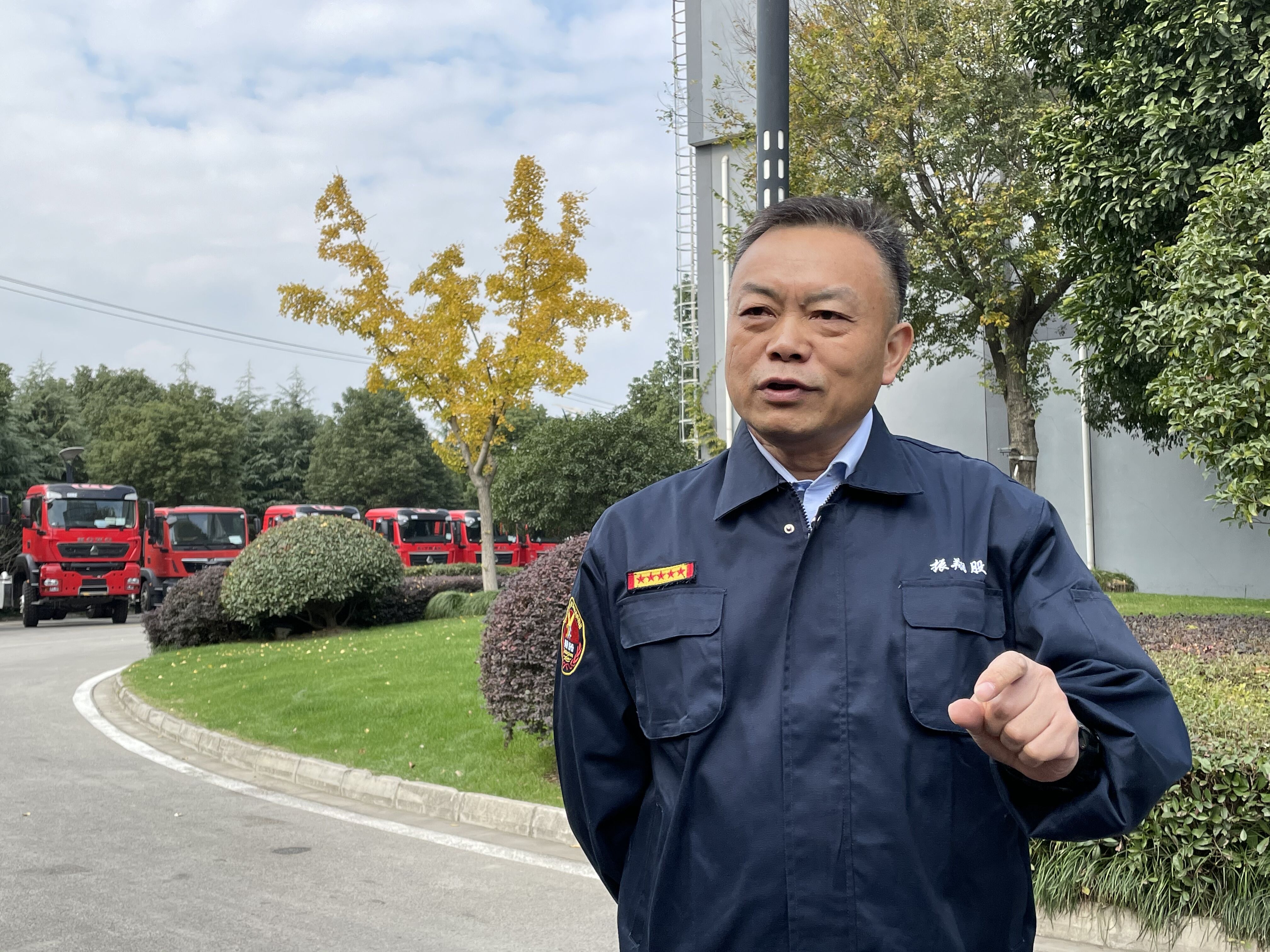 随后,记者团来到了江苏振翔车辆装备股份有限公司,这是一家以生产制造特种车辆装备为主的公司。公司偌大的广场上一字排开停满了正在等待测试性能的红色特种车辆。这“壮观”的场面让采访团里的95后们感到新奇又兴奋,纷纷对董事长赵文提出问题,采访现场一时热闹非凡。