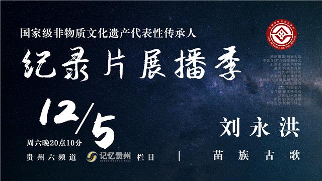 12月5日周六20点10分,“国家级非物质文化遗产代表性传承人”纪录片展播季第七集《苗族古歌国家级传承人——刘永洪》将在贵州广播电视台科教健康频道(贵州6频道)《记忆贵州》栏目播出,敬请届时收看。