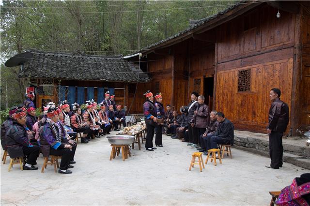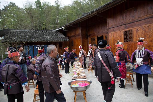 苗族历来重视婚礼。苗族的婚礼以繁、奇、古为特点,有许多固定的仪式。这天,村里有一户人家举行婚礼。新娘家按照传统习俗,邀请刘永洪在婚礼的第三天演唱古歌。