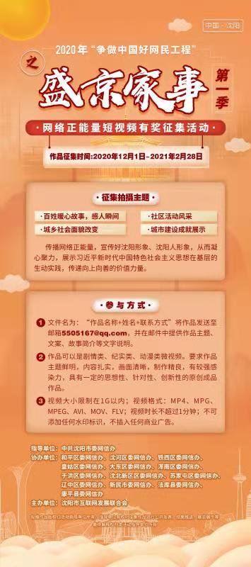 为深入推进“争做中国好网民工程”,吸引广大网民自觉参与建设先进网络文化,从多种角度反映城市昂扬奋进的精神风貌,助力沈阳高质量发展、新时代振兴,中共沈阳市委网信办决定在全市开展“盛京家事”网络正能量短视频征集活动,现启动第一季征集活动。