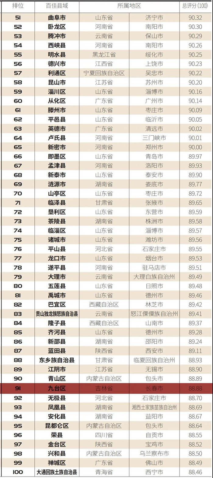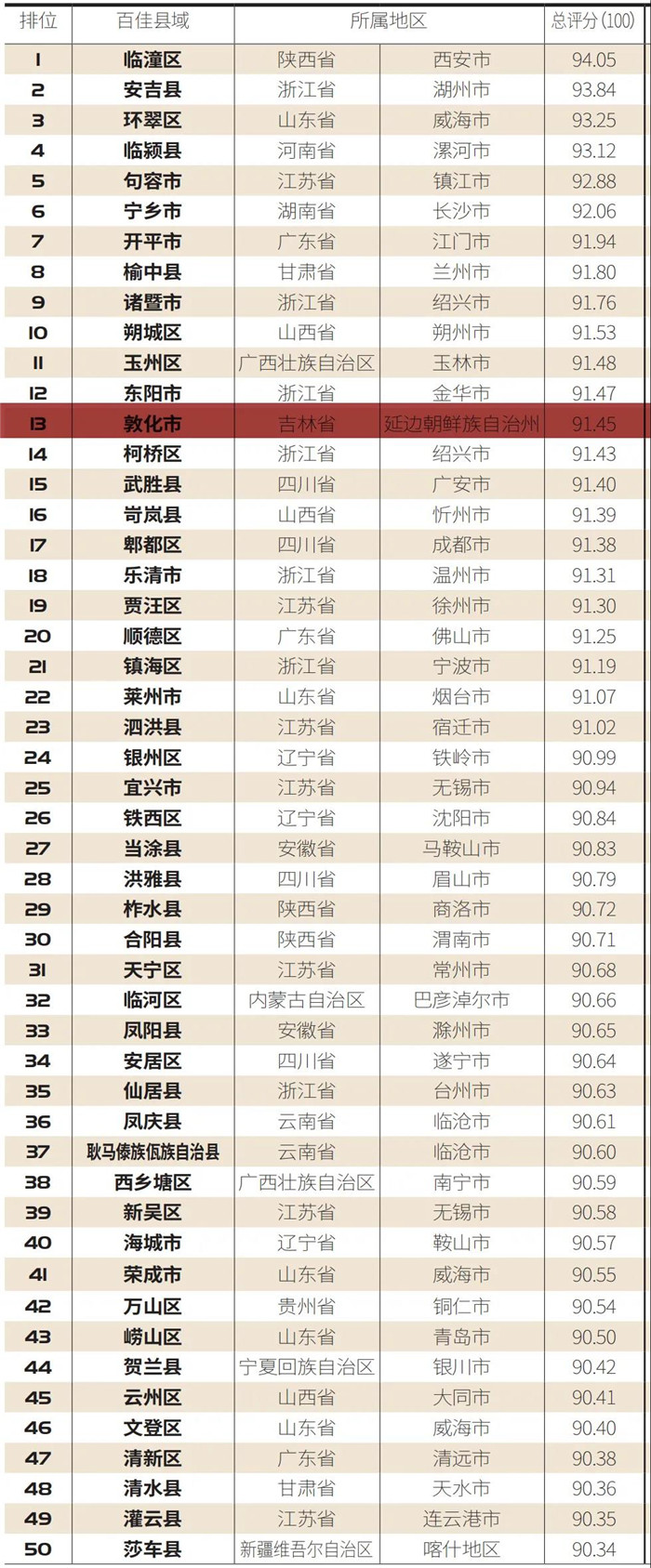 吉林省2地上榜分别是延边州敦化市、长春市九台区。