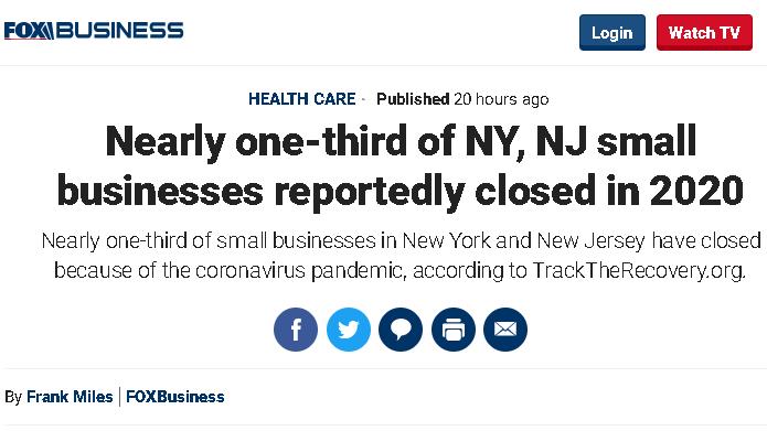 △福克斯新闻报道,受疫情影响,美国纽约州和新泽西州目前已有近三分之一的小企业关门