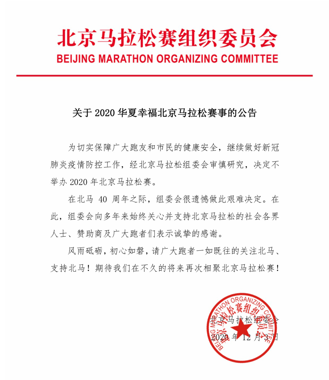 为切实保障广大跑友和市民的健康安全,继续做好新冠肺炎疫情防控工作,经北京马拉松组委会审慎研究,决定不举办2020年北京马拉松赛。
