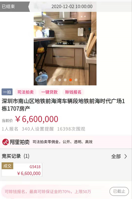 12月2日,阿里拍卖平台显示,位于深圳前海的一套49.36平方米的房产,以660万元的底价完成司法拍卖,全程仅有一位买家举牌。