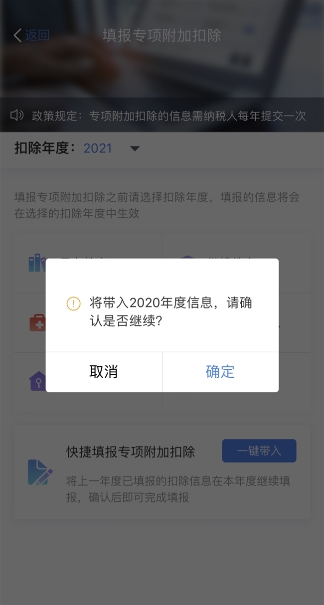 根据操作指引,填报专项附加扣除信息可以快捷操作:选择扣除年度2021年,一键带入,如有变动,还可以点击修改,然后一键确认完成该项操作。根据国家政策规定,次年享受专项附加扣除的内容需于每年12月进行确认。纳税人未及时确认的,扣缴义务人于次年1月起暂停扣除,待纳税人确认后再行办理专项附加扣除。